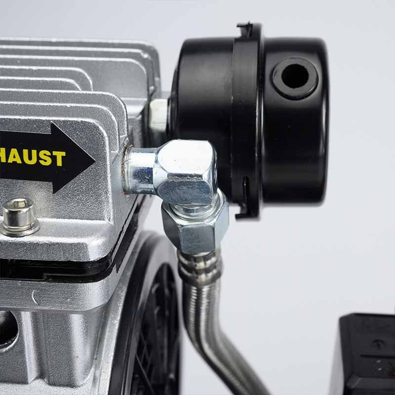 Αεροσυμπιεστής χαμηλού θορύβου με κινητήρα χωρίς λάδι. Με δύο μανόμετρα για ένδειξη πίεσης αέρα καζανιού και εξόδου. Το ελαφρύ καζάνι του σε συνδυασμό με την εργονομική λαβή και το σετ τροχών που φέρει , το καθιστούν εύκολο μεταφορά.