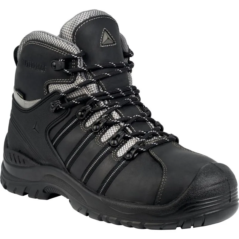 Αδιάβροχα μποτάκια ασφαλείας κατασκευασμένα από δέρμα Buffalo με μπροστινή ενίσχυση σε PU. Προστασία που διέρχεται από μια καινοτόμο ιδέα, της DELTA PLUS, στεγανότητας και αντοχής στο νερό. Μη μαγνητικό παπούτσι εργασίας.