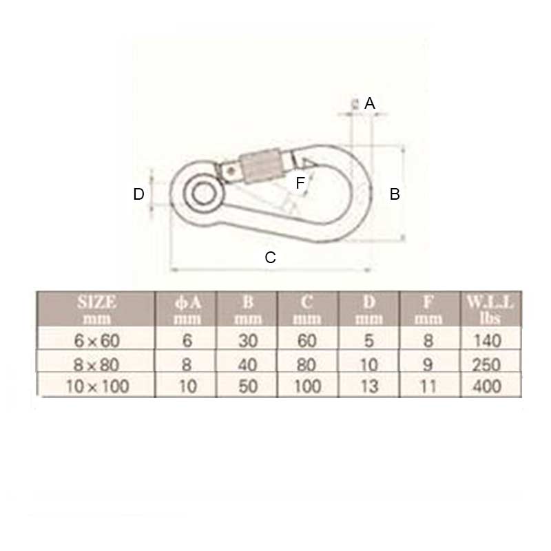 Μέγεθος (mm) Φ Α (mm) B C D F WLL (lbs) 6 x 60 6 30 60 5 8 140 8 x 80 8 40 80 10 9 250 10 x 100 10 50 100 13 11 400 - Για περισσότερες πληροφορίες σχετικά με τις διαστάσεις του προϊόντος μπορείτε να συμβουλευτείτε τον παραπάνω πίνακα και τη δεύτερη φωτογραφία του προϊόντος.