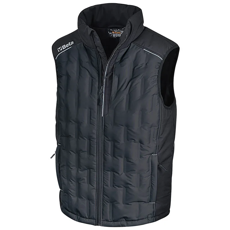 Ο συνδυασμός δύο υφασμάτων και χρωμάτων – γκρι και μαύρο – και το νέο σύστημα καυτού καπιτονέ έχουν ως αποτέλεσμα ένα καινοτόμο, μοντέρνο ένδυμα, ιδανικό τόσο για την εργασία όσο και για τον ελεύθερο χρόνο.