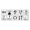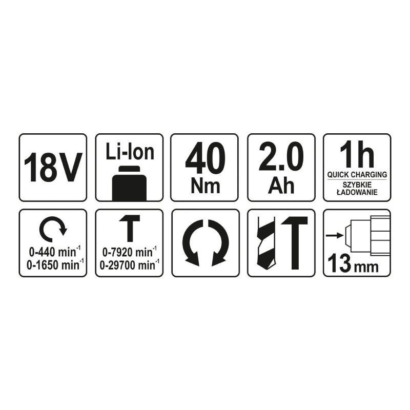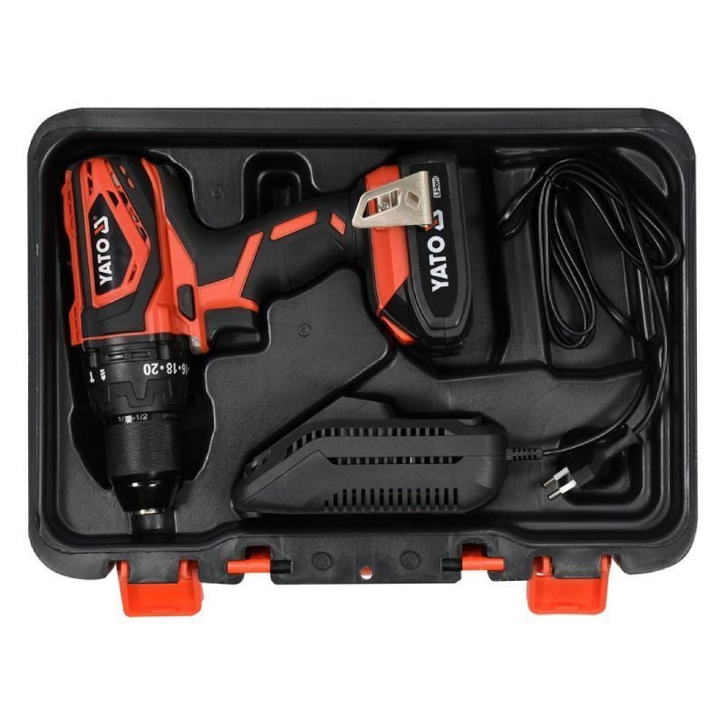 - Η συσκευασία περιέχει: 1 Μπαταρία 2Ah, Φορτιστή, Σκληρή θήκη, Τρυπάνια