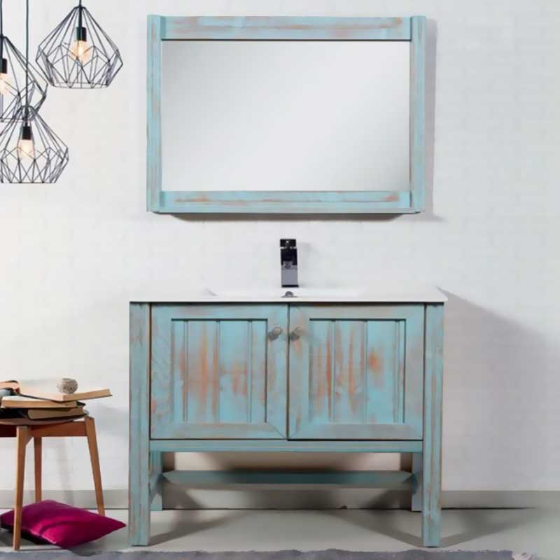 Ντουλάπι νιπτήρα μασίφ πατίνα γαλάζιο την οποία μπορείτε να βρείτε ολοκληρωμένο σετ έπιπλο μπάνιου το οποίο αποτελείται από καθρέπτη το έπιπλο και το νιπτήρα.