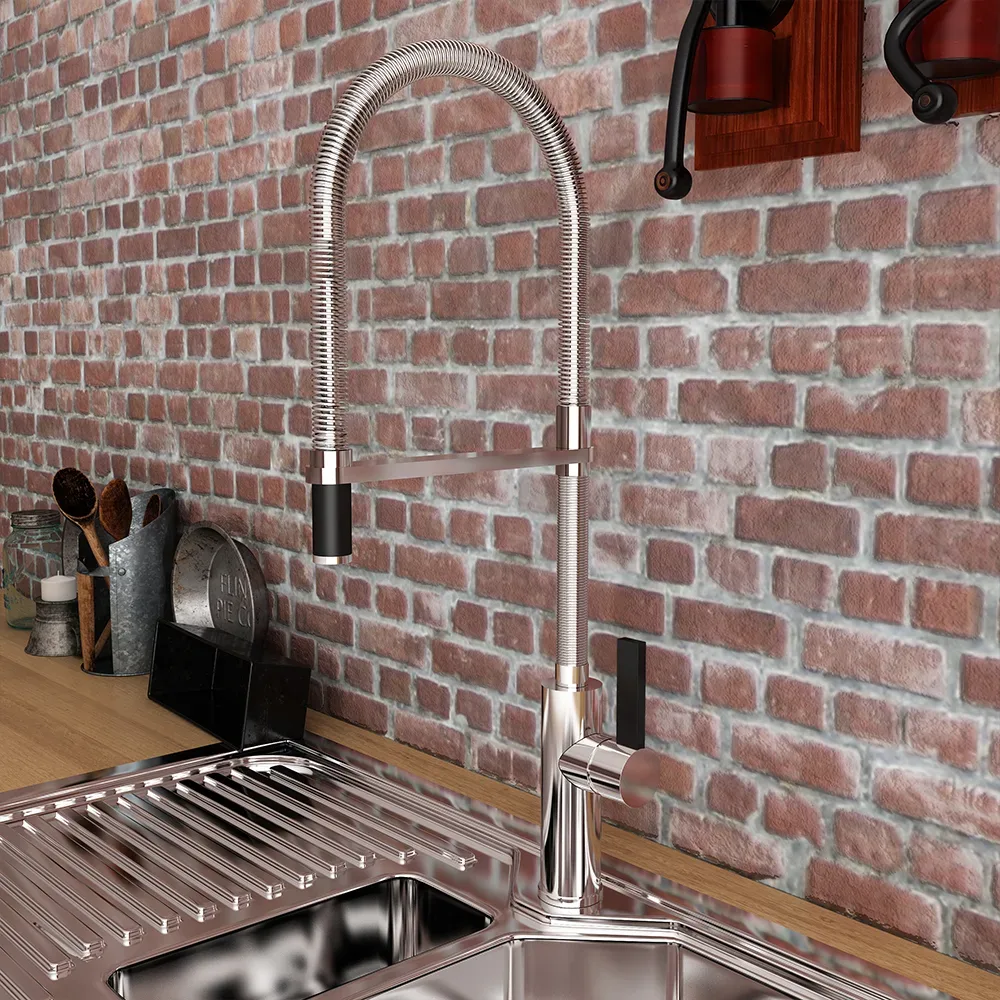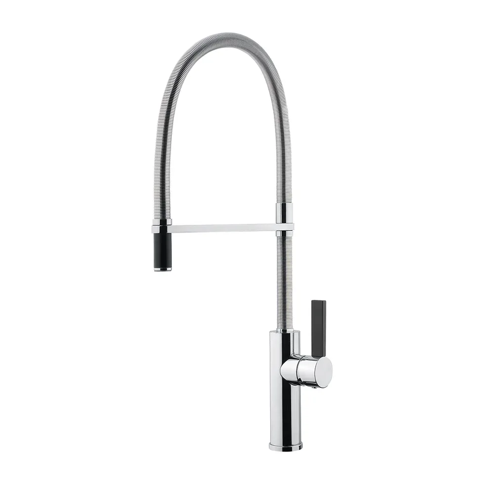 Επαγγελματική μπαταρία κουζίνας με περιστρεφόμενο κορμό, μεταλλικό σπιράλ, με μαύρο πόμολο και μαύρο ρουξούνι. Η Chef Professional φέρει την υπογραφή της εταιρείας Armando Vicario και χαρακτηρίζεται από εργονομικό design υψηλών σχεδιαστικών προδιαγραφών και κορυφαία κατασκευαστική ποιότητα, που προσφέρει μεγάλη ευκολία στη χρήση.