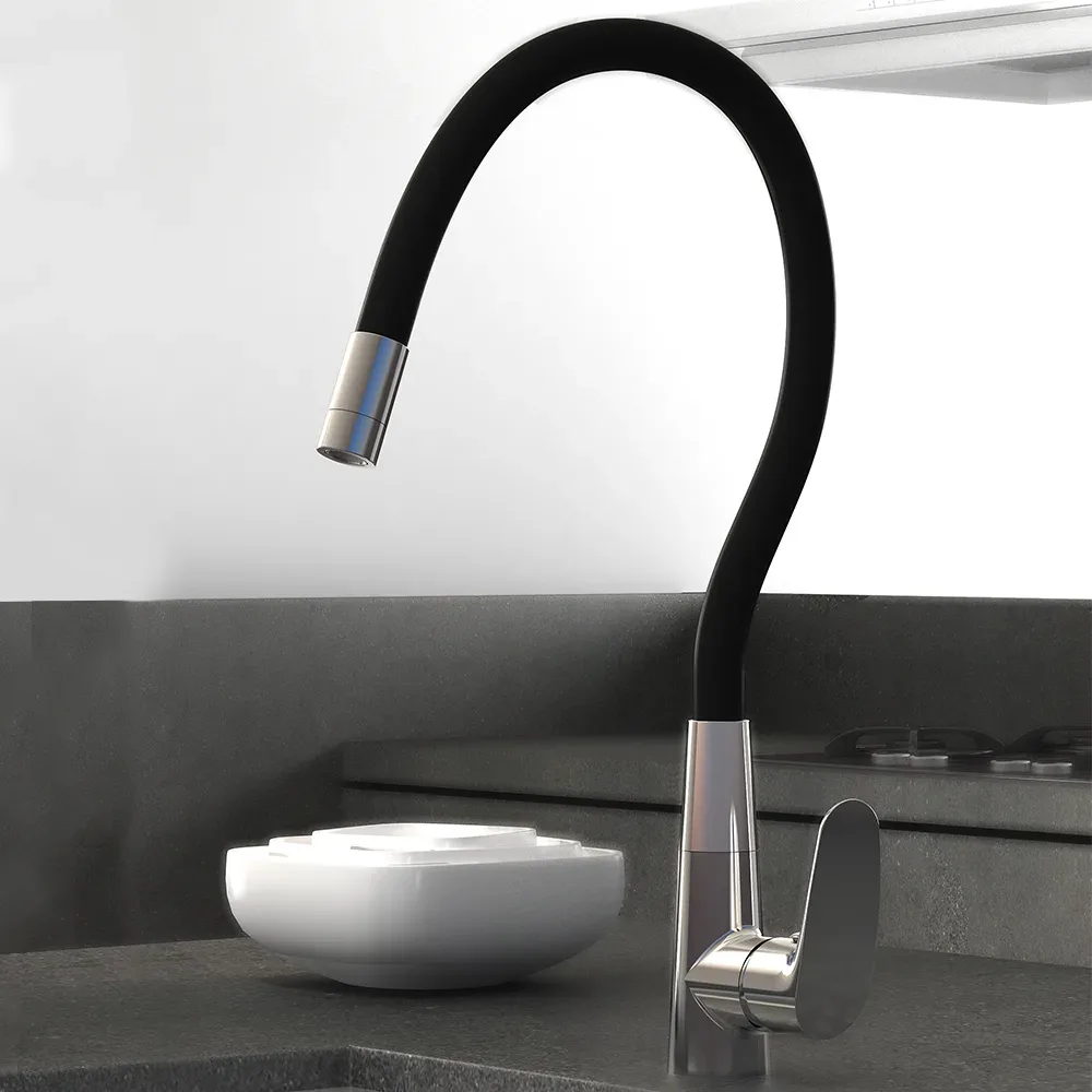 Μπαταρία κουζίνας Orabella, Flex χρωμέ με εύκαμπτο, περιστρεφόμενο, μαύρο ματ ρουξούνι από σιλικόνη. Πρόκειται για μια μοντέρνα μπαταρία πάγκου, η οποία είναι κατασκευασμένη από τον οίκο Orabella, από υψηλής ποιότητας ορείχαλκο και μαύρη ματ σιλικόνη.