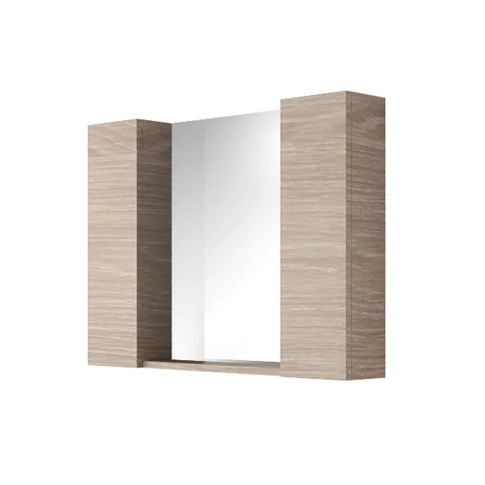 Καθρέπτης μπάνιου με εταζέρα, ο οποίος μπορεί να πάρει δεξιά ή αριστερά ντουλάπια, κατόπιν επιλογής. Διατίθεται σε πέντε διαφορετικές αποχρώσεις ξύλου και σε λευκό χρώμα Laminate καθώς και σε μαύρο και λευκό γυαλιστερό ακρυλικό σε mdf.