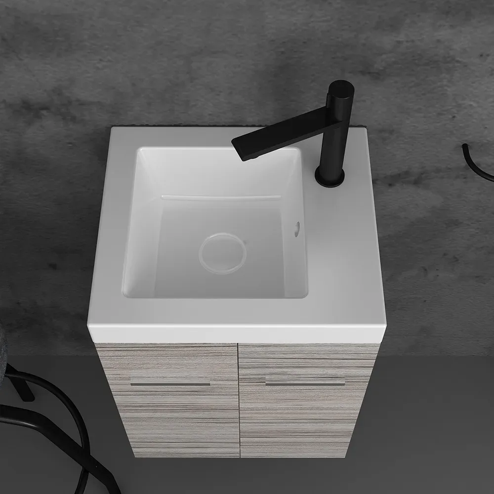 Κρεμαστό έπιπλο μπάνιου Type 40 – σειρά επίπλων Compact. Ένα μικρό έπιπλο ιδανικό για πολύ μικρά μπάνια. Αποτελείται από, κρεμαστή βάση με δύο πόρτες με μηχανισμούς κλεισίματος soft close και νιπτήρα από πορσελάνη. Μπορείτε να ολοκληρώσετε την εικόνα του επίπλου προσθέτοντας καθρέπτη δικής σας επιλογής (ντουλάπι ή εταζέρα) και τα πόμολα που ταιριάζουν στο δικό σας μπάνιο. Όλα τα έπιπλα της εταιρείας Orabella μπορούν να πάρουν στήλες μπάνιου επιδαπέδιες ή κρεμαστές για επιπλέον χώρο αποθήκευσης, ενώ υπάρχει δυνατότητα προσθήκης ντουλαπιού πλυντηρίου σε χρώμα δικής σας επιλογής. Διατίθεται σε πέντε διαφορετικές αποχρώσεις ξύλου και σε λευκό χρώμα Laminate καθώς και σε μαύρο και λευκό γυαλιστερό ακρυλικό σε mdf. Κατόπιν επιλογής, μπορεί να συνοδευτεί με επιτοίχιο, γραμμικό φωτιστικό μπάνιου Led.