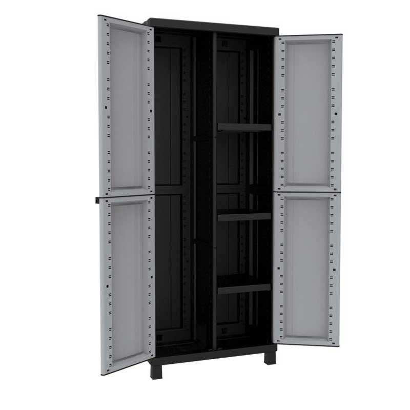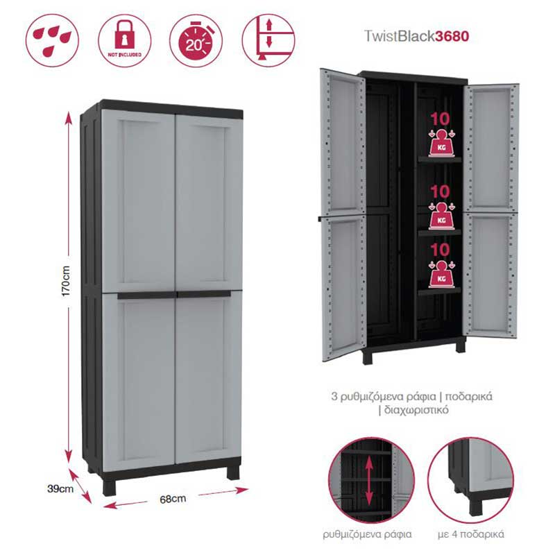 - Πλαστική ντουλάπα με χώρισμα δίφυλλη Twist Black με δύο φύλλα κατάλληλη για την εύκολη και σωστή αποθήκευση διαφόρων αντικειμένων.